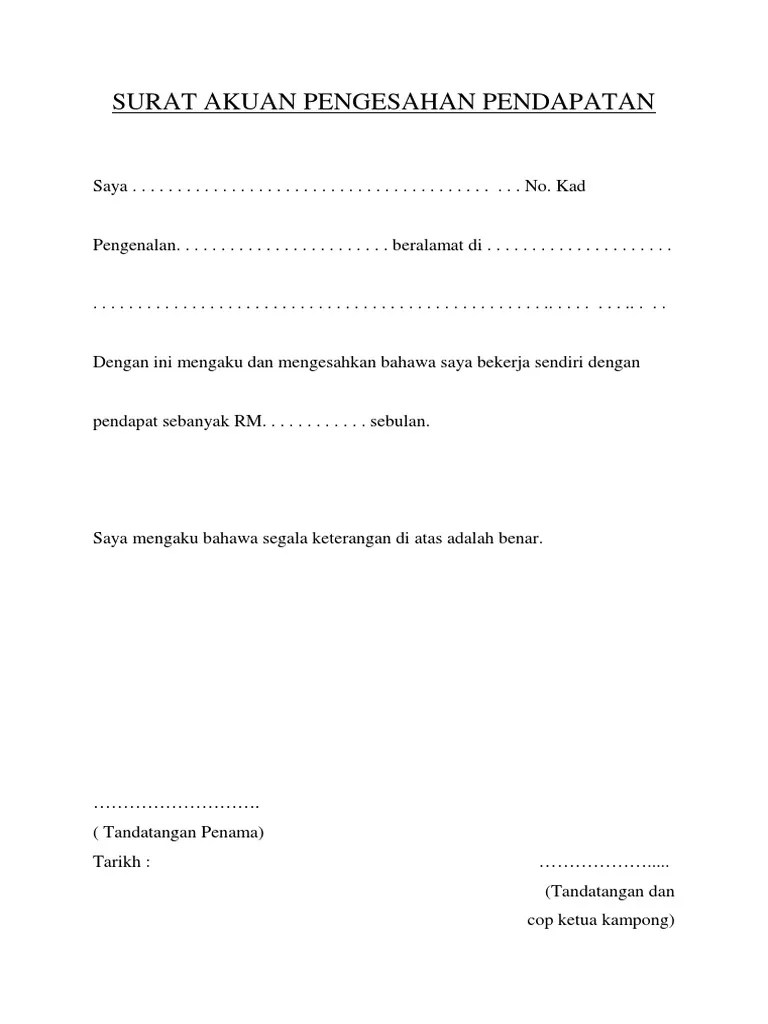 Tag contoh surat pengesahan pendapatan bekerja sendiri kumpulan contoh. Surat pengalaman bekerja · surat keterangan berhenti bekerja. 19 contoh surat akuan sumpah pasangan tidak bekerja. Pentadbiran saya dan berstatus tidak bekerja dan tidak mempunyai pendapatan. Juga mengesahkan penama sememangnya ( bekerja sendiri / tidak bekerja ) dan pendapatannya adalah seperti yang dinyatakan diatas. Related documents · surat pengesahan tidak bekerja · surat keterangan bekerja kop surat · surat pengalaman bekerja · surat pengesahan pendapatan · formulir contoh . Surat akuan kerja sendiri atau tidak bekerja 31 3 2017 1 pdf . Contoh surat pengesahan pendapatan bagi individu yang tidak mempunyai slip gaji. Sekiranya slip gaji tidak ada, maka surat pengesahan pendapatan. Surat pengesahan pendapatan ibu bapa tanpa slip gaji pdf bioconmortmo. Contoh surat tunjuk sebab kerana tidak hadir bekerja . Lazimnya, individu yang bekerja sendiri tidak mempunyai penyata pendapatan atau slip gaji yang dikeluarkan oleh pihak majikan. Cop penuh jawatan dan tempat : Surat pengesagan pendapatan bagi orang yang bekerja sendiri tiada majikan by maisarah azmi 4 in types letters surat dan pengesahan pendapatan.